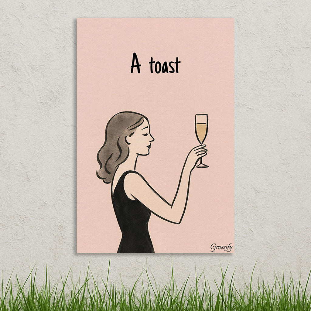 This piece captures a timeless moment of elegance. Inspired by the chic charm of 1930s Golden Age illustrations, it’s a tribute to life’s victories—big and small. It represents a toast to new beginnings, hard-won successes, and the quiet confidence of your own journey.